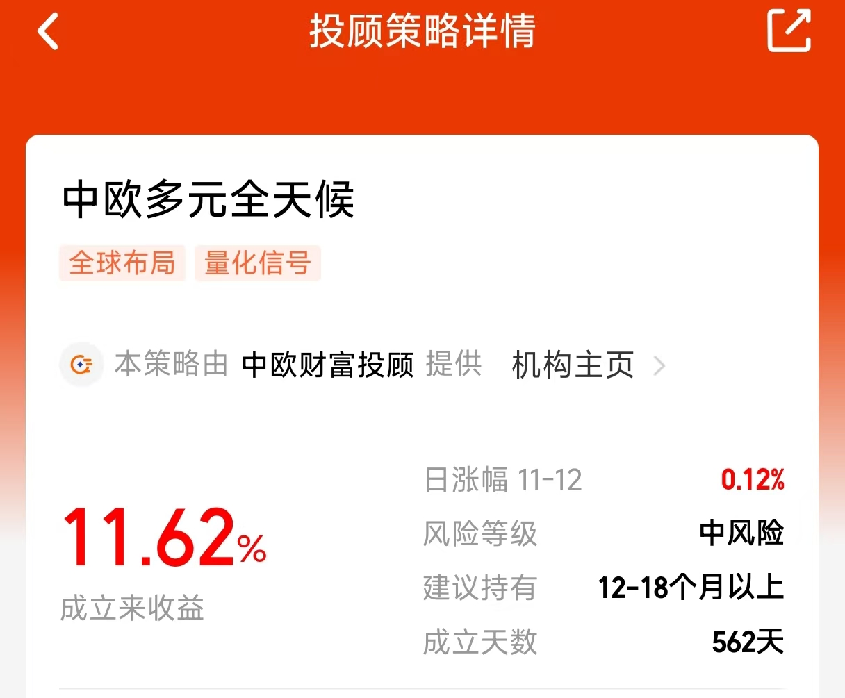 投资时间长了会发现,比起预测市场,更重要的是拥有一套能适应不同环境的策略。中欧多元全天候这个投顾组合就给了我这样的感觉。它不依赖于对市场方向的判断,而是通过量化方法,将资金分散配置于全球低相关性的七大类资产中,力求实现平衡。像现在A股处于4000点,一些传统策略可能面临挑战,但这个组合通过全球配置和动态调整,依然展现出了不错的韧性。我在天天基金投顾管家“三笔钱投顾”专区看到,其近一年收益9.39%,最大回撤-2.02%,波动率2.76%的数据,很好地印证了这一点。