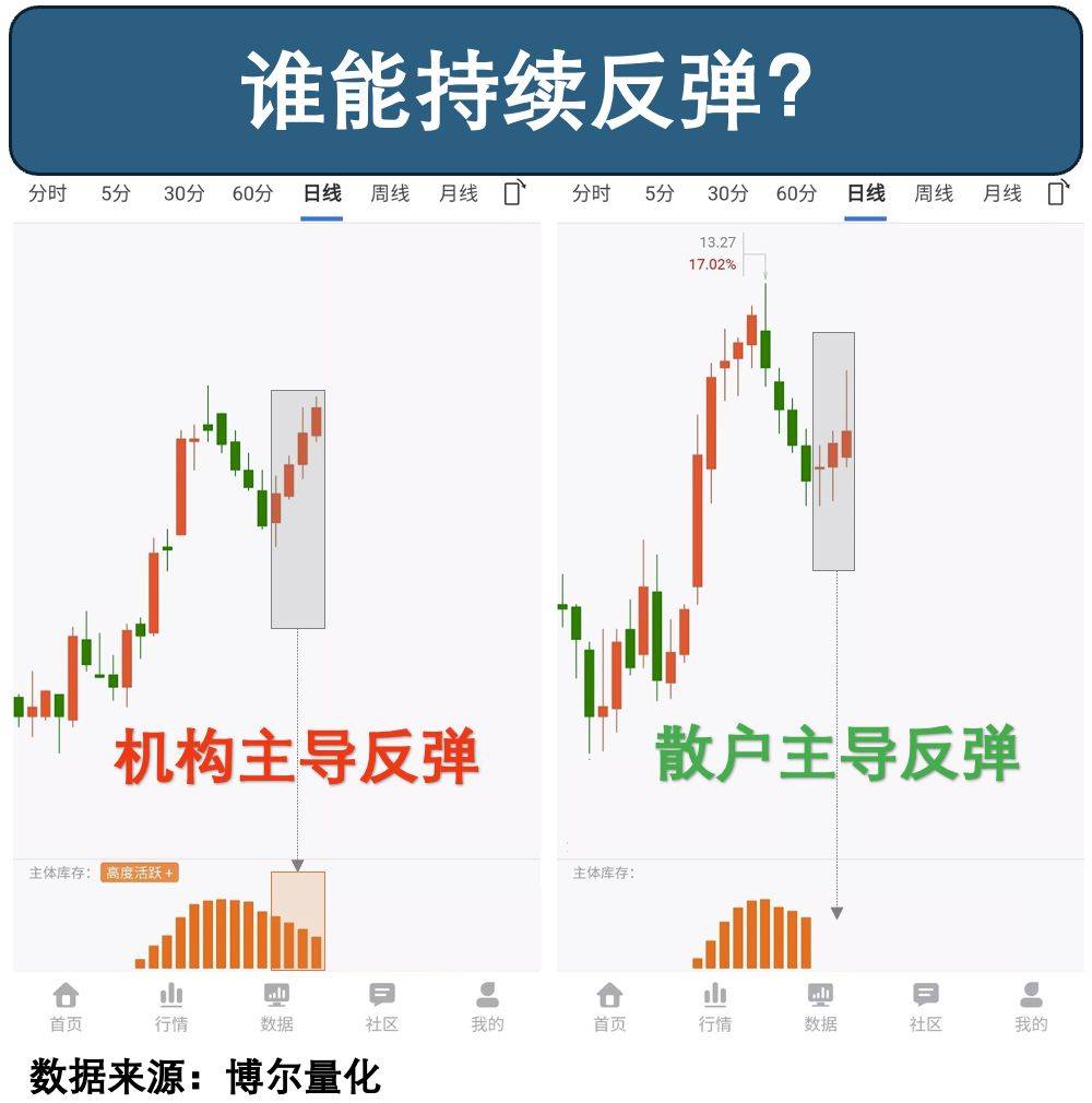 第一只是某新能源标的,反弹时伴随着清晰的机构库存重建信号;另一只消费股虽然单日大涨7%,但数据揭示这是典型的无库存反弹。结果?前者三周累计涨幅抵得上后者三个月的波动。