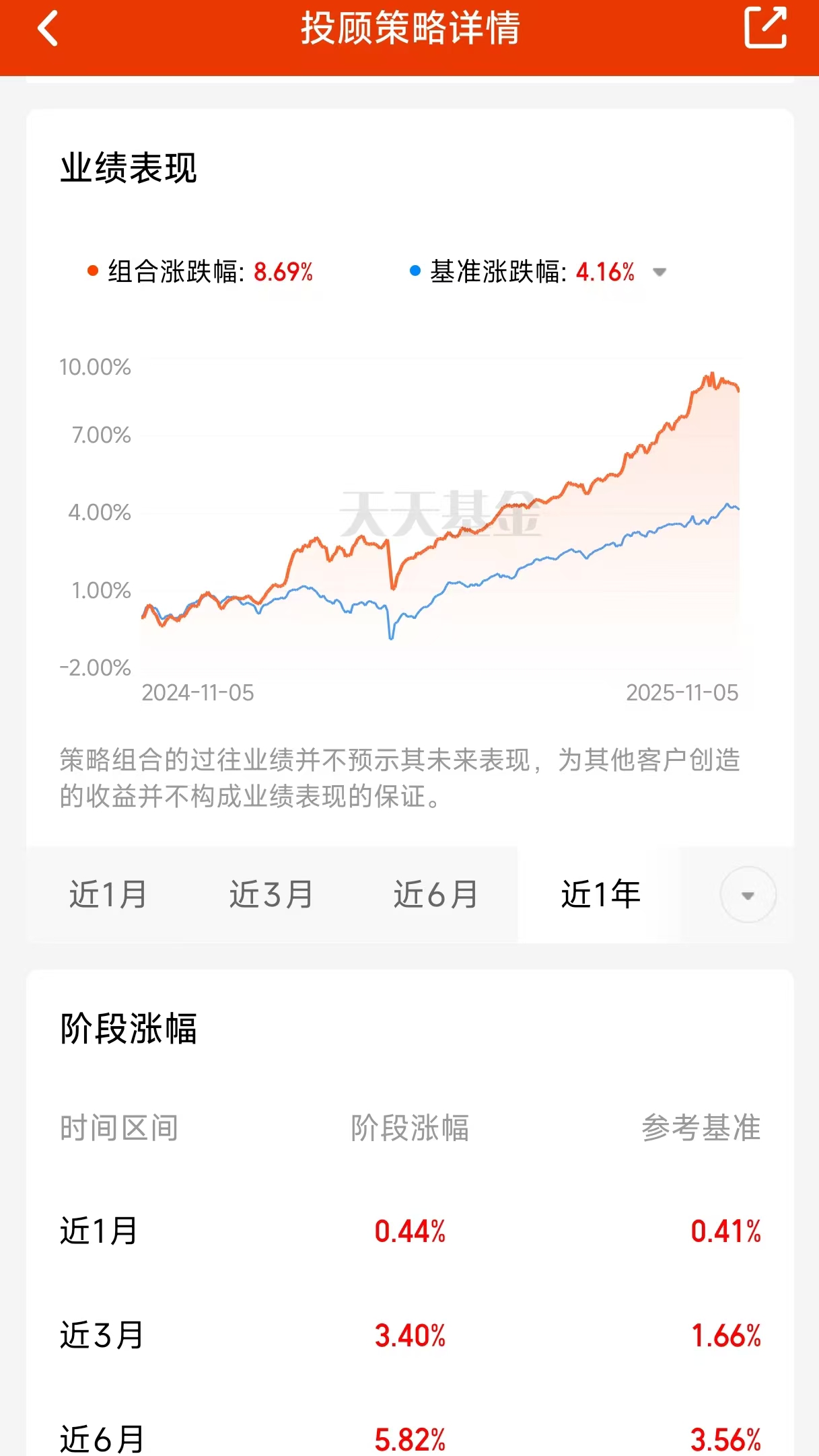 投资时间长了会发现,与其追逐市场热点,不如选择能适应不同环境的策略。中欧多元全天候投顾组合就是这样的思路,它借鉴了经典的全天候理念并进行了本土化优化,通过量化模型将资金分散配置于A股、港股、美股、债券、商品等七大类低相关性资产,追求整体平衡。从结果看,近一年8.69%的收益,最大回撤2.02%,波动率2.76%,体现了分散配置对平滑波动的效果。该组合在天天基金投顾管家“三笔钱投顾”板块中可见,无限购约束,便于随时关注。
