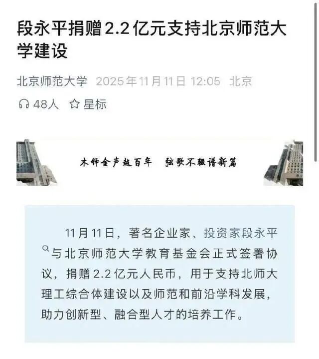 事实上,段永平曾多次为高校和公益领域捐资。早在2006年,段永平就联手网易丁磊向浙江大学捐资4000万美元;2010年段永平与妻子刘昕将所募集善款3000万美元捐助母校中国人民大学;2011年,段永平与妻子刘昕捐资设立浙江大学“心平奖教金基金”,该基金每年嘉奖8位教师,连续20年,奖金最高达每人100万元。