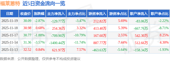证券之星消息,截至2025年11月19日收盘,福莱蒽特(605566)报收于30.09元,下跌2.87%,换手率0.93%,成交量1.24万手,成交额3741.02万元。